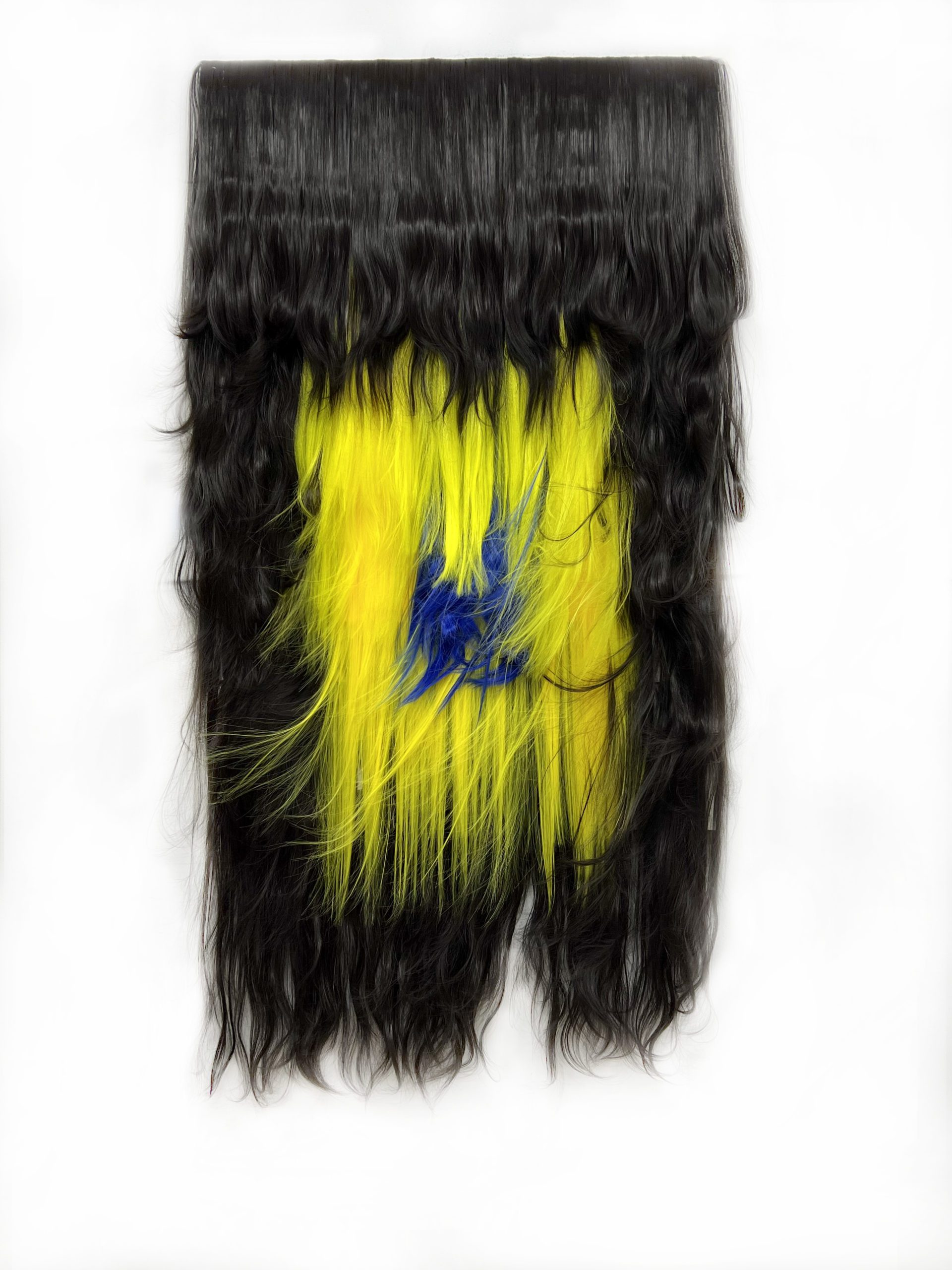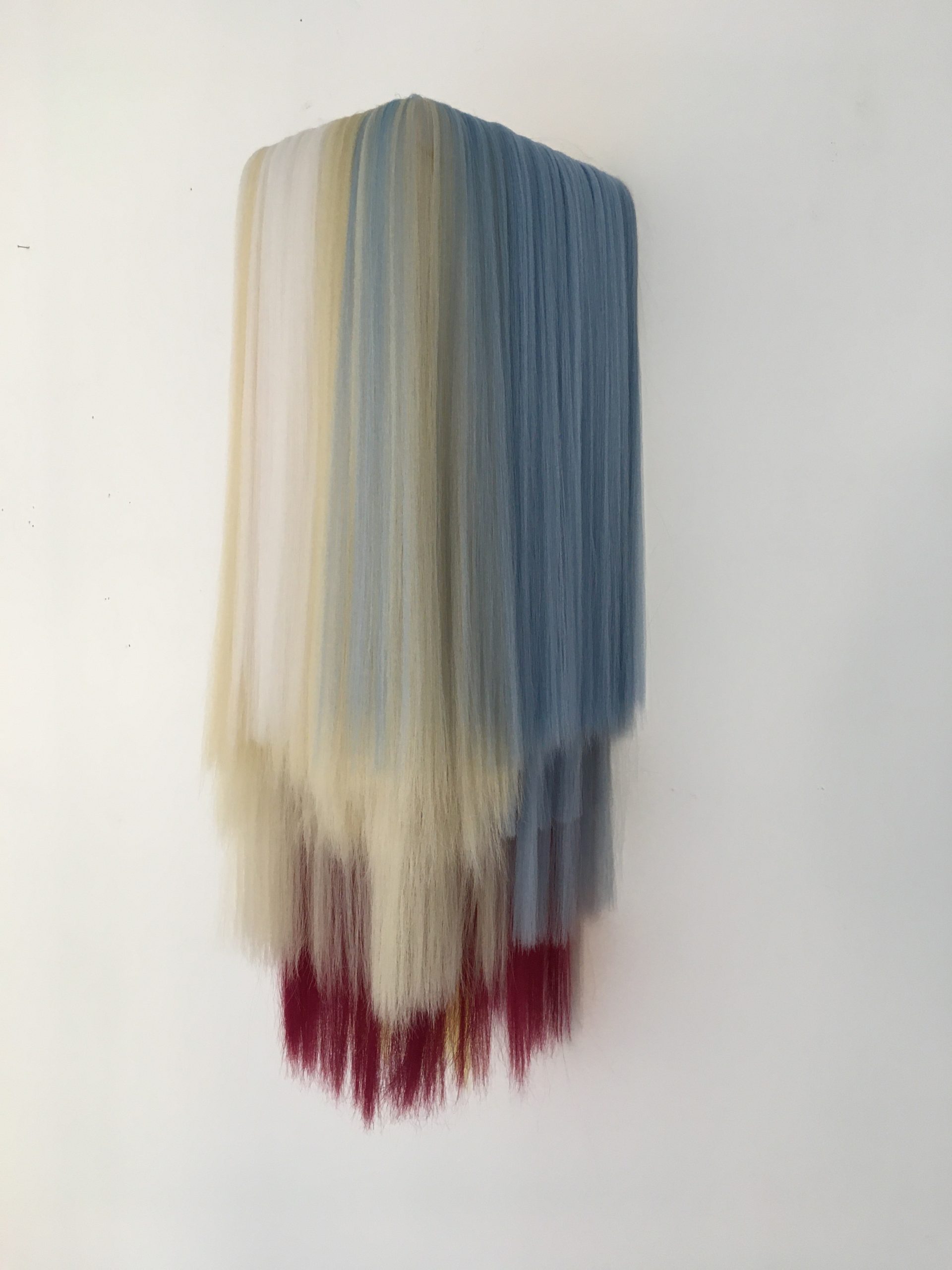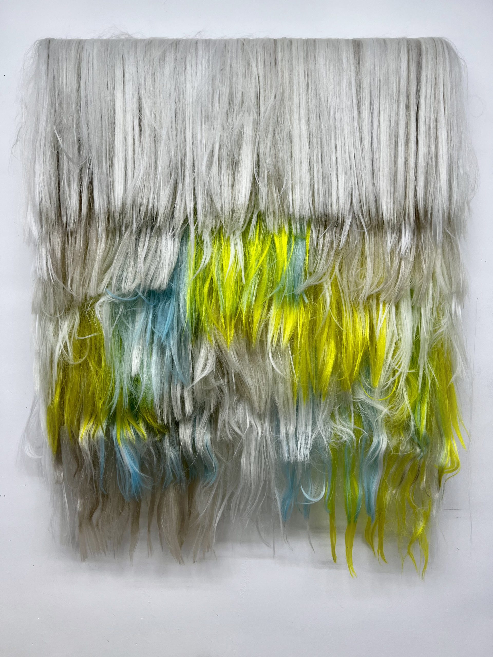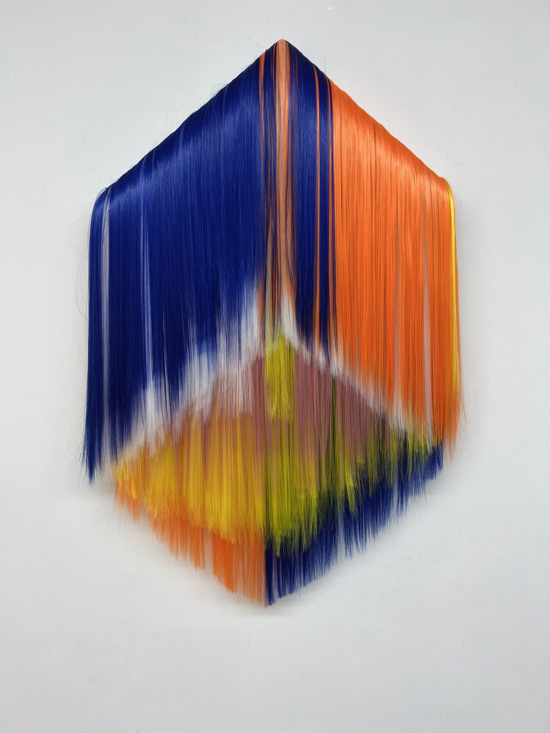 His artwork’s roots are founded in Persian tradition and in its millenary skill of weaving rugs and carpets. Though this artist applies his technique and knowledge using a different material in order to create a contemporary interpretation of a texture and add to it a cosmopolitan and psychic touch. The tapestries woven by Alizadeh are created using synthetic hair extensions, that he composes in vibrant fluorescent colour palettes. The East and the West meet in Alizadeh’s works, generating a complex perceptual texture. Also, this artist takes inspiration from the morphology and colours of the Iranian landscape or the rural region he visits witnessing the nomad’s travel. Such perception of reality is mixed with the sensibility of the pixelated images in use in the digital culture. Another aspect that has influenced this work has to be found in the patterns of mosques stained glasses and the kaleidoscopic reflections that those project on the floors. Many other transfigured elements create a complex imaginary, with sophisticated coloristic weaves. The vaporous strands overlap and intersect, generating rhythms, voices and sounds of which the artist’s perceptive background echoes.