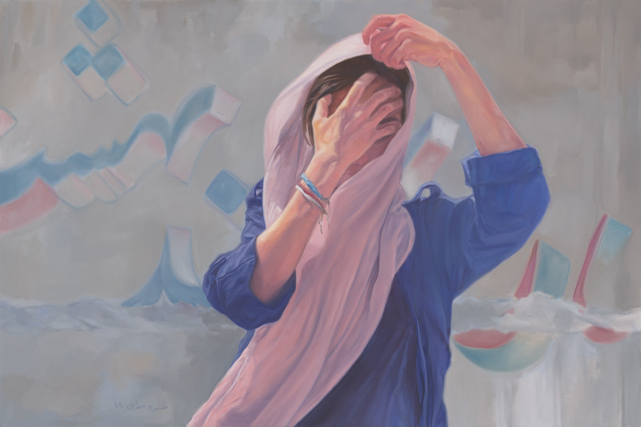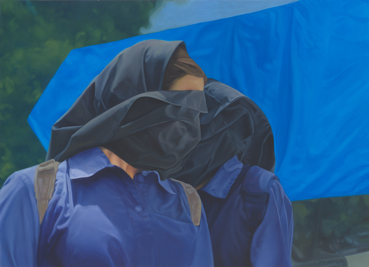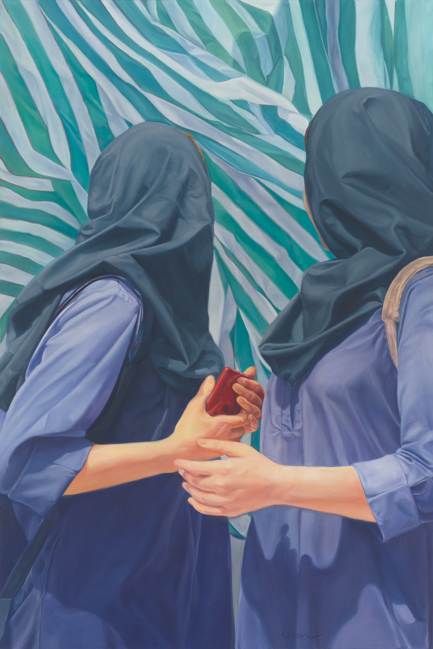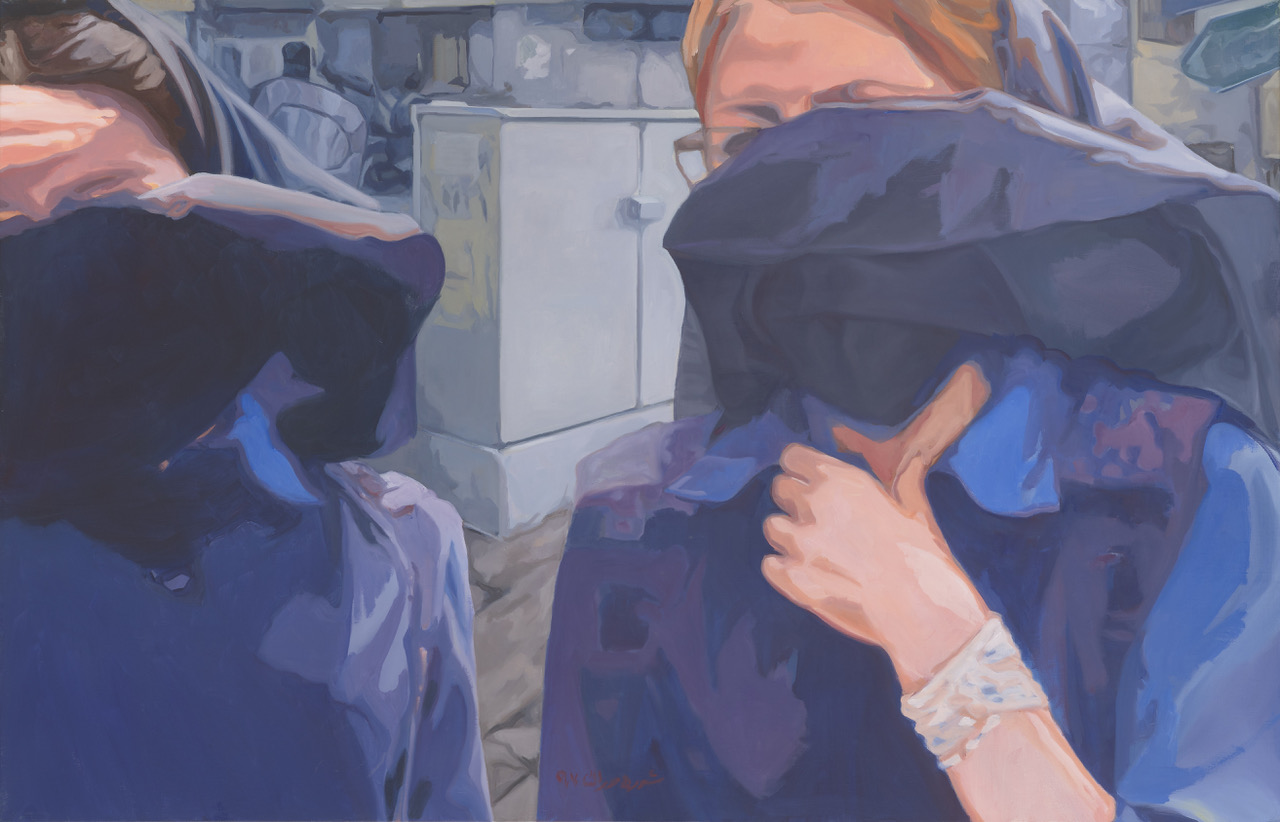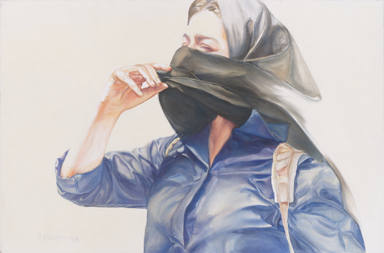 Shohreh Mehran’s method of making art might seem straightforward: she photographs her subjects; digitally manipulates the color, backgrounds and compositions of those photographs; prints them; and paints the result with precision. This may seem like the typical photo-realist approach. The simplicity of the method – take a piece of life, tweak it, and represent it accurately – is immediately complicated, however, when one realizes that she is either taking photographs of photographs, or photographing subjects that are deliberately and persistently avoiding the photographer. In other words, Mehran’s subjects are either veiling themselves behind the ideology of representation, or veiling themselves altogether, avoiding representation, and presenting this avoidance itself as a subject for representation. Mehran is, therefore, a photo-realist painter only in a strict or skewed sense: her work does not simply represent a reality, it represents a reality in the act of escaping representation.