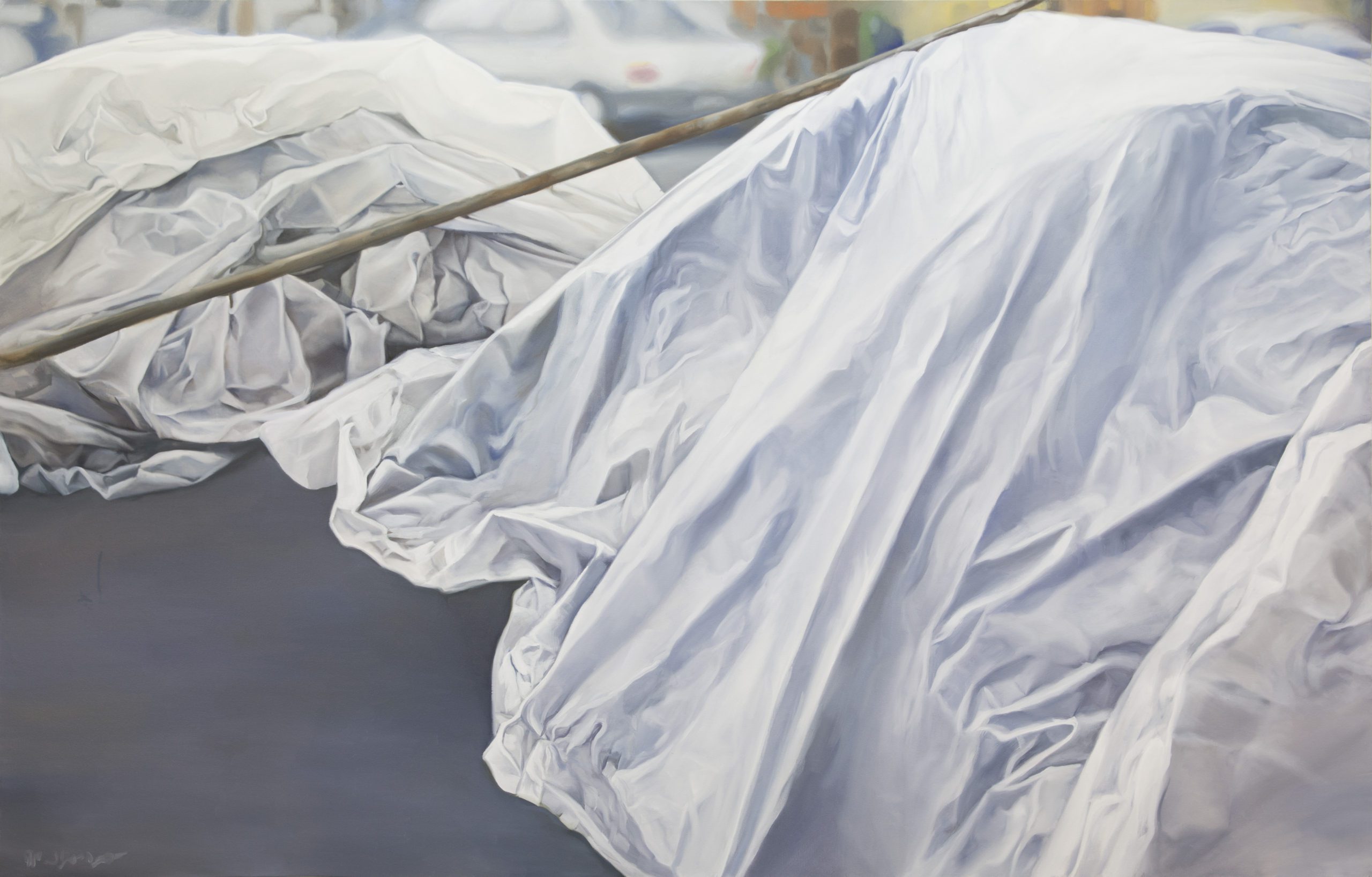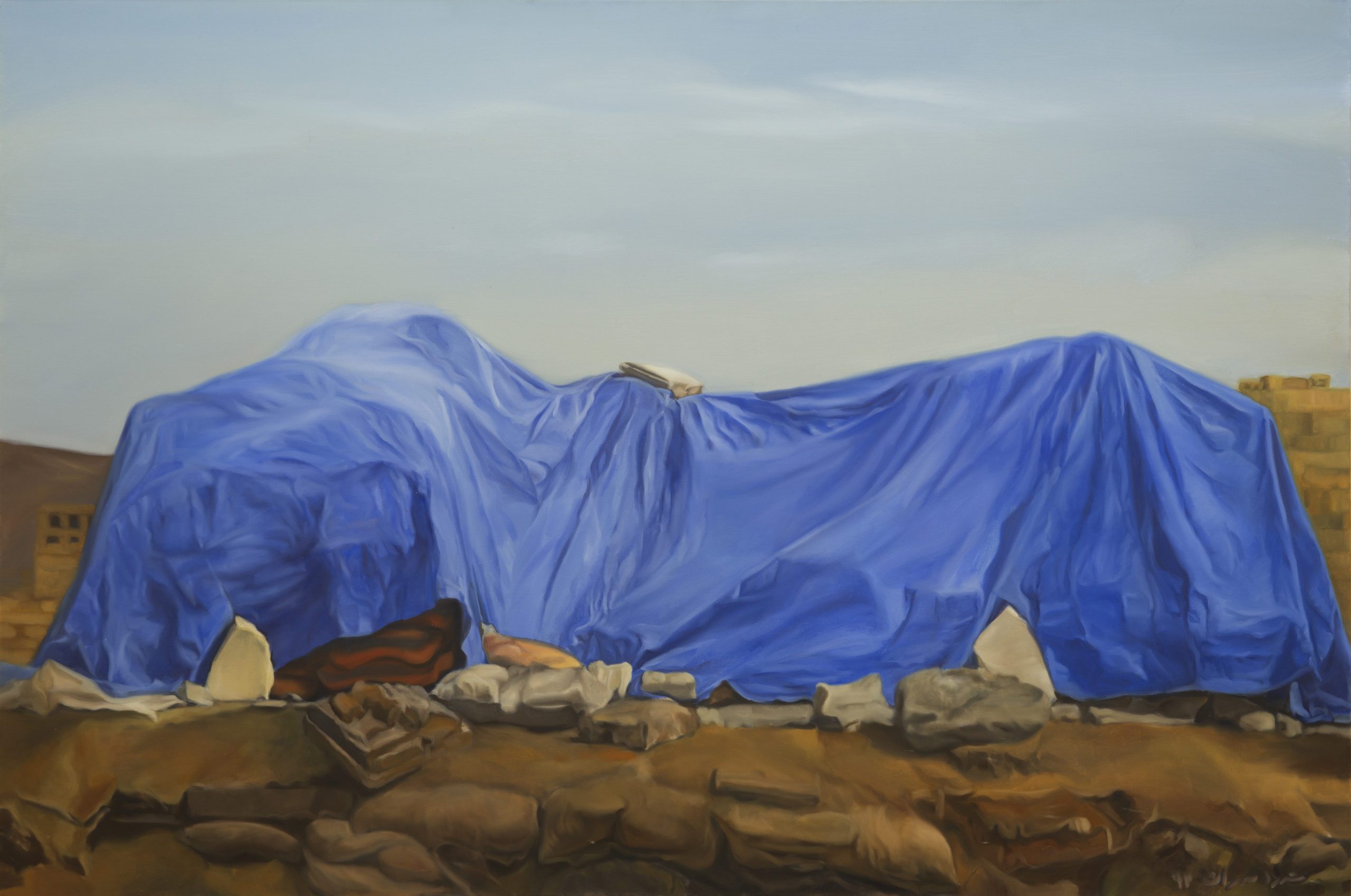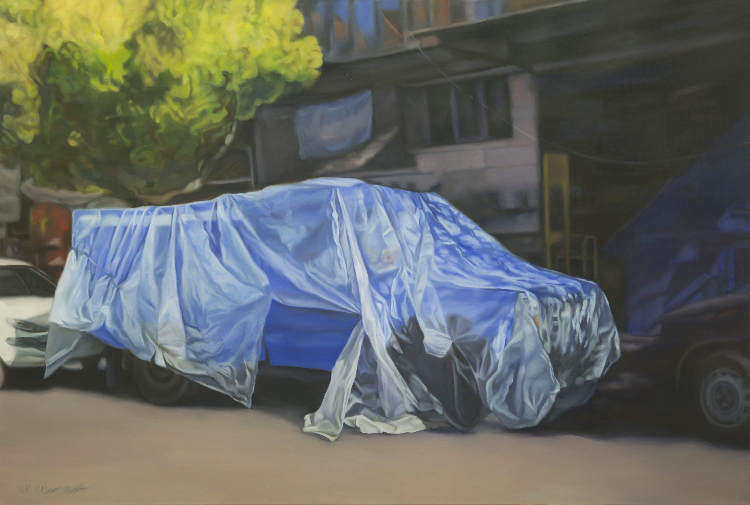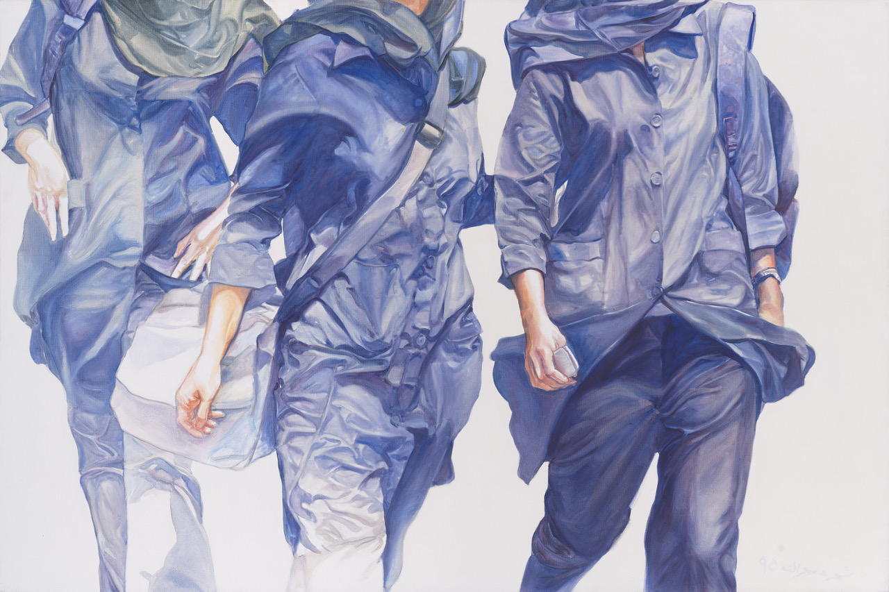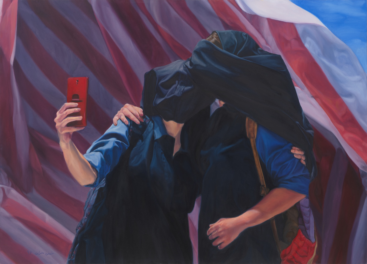 Shohreh Mehran’s method of making art might seem straightforward: she photographs her subjects; digitally manipulates the color, backgrounds and compositions of those photographs; prints them; and paints the result with precision. This may seem like the typical photo-realist approach. The simplicity of the method – take a piece of life, tweak it, and represent it accurately – is immediately complicated, however, when one realizes that she is either taking photographs of photographs, or photographing subjects that are deliberately and persistently avoiding the photographer. In other words, Mehran’s subjects are either veiling themselves behind the ideology of representation, or veiling themselves altogether, avoiding representation, and presenting this avoidance itself as a subject for representation. Mehran is, therefore, a photo-realist painter only in a strict or skewed sense: her work does not simply represent a reality, it represents a reality in the act of escaping representation.