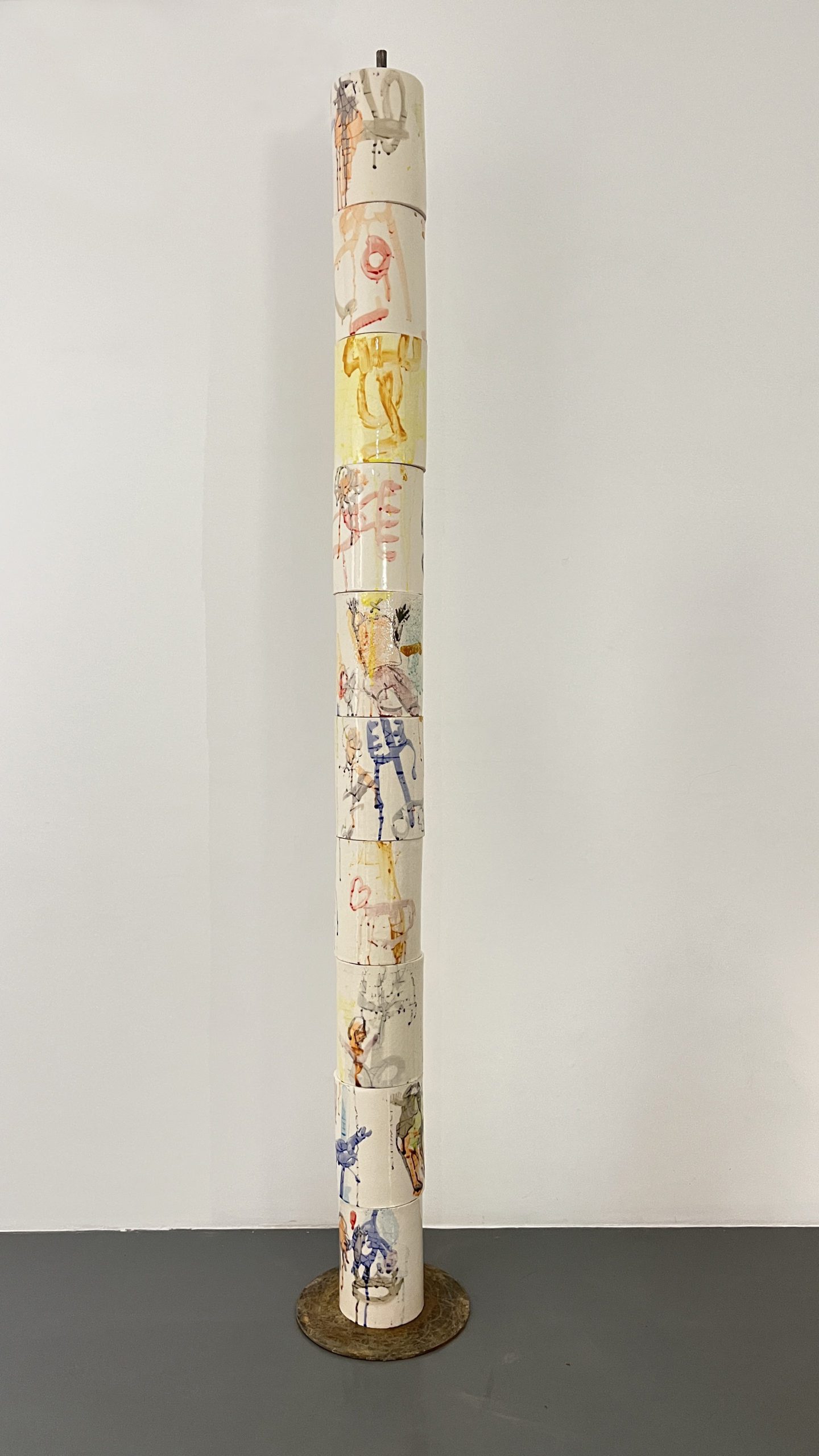 This exhibition is presented in two distinct sections: ‘Reliefs’ and patterned ‘Pillars’. The reliefs, inspired by the quotidian rhythms of life, are an interplay of human forms and objects, imbued with a visual wit that amplifies their communicative potency. They invite viewers not only to engage with the narrative but also to explore the playful dialogue between form and meaning.